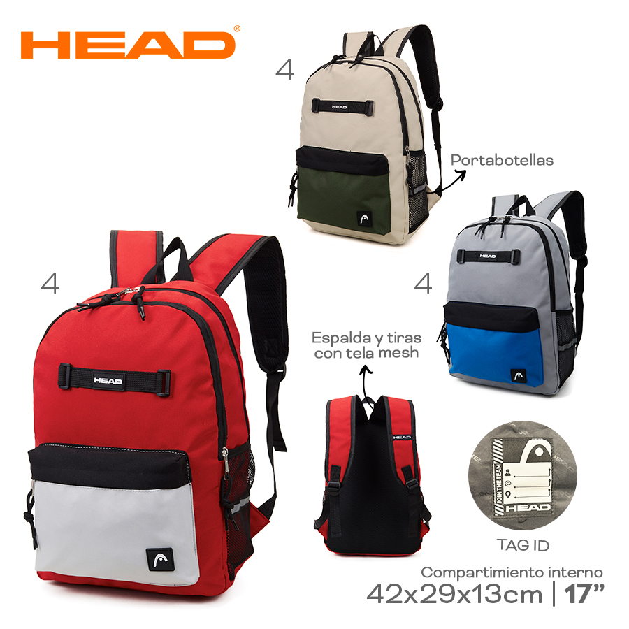 Descripción: La mochila Head combina diseño deportivo, resistencia y practicidad. Ideal para el uso escolar, universitario o diario, cuenta con doble compartimiento y espacio especial para tu notebook, manteniendo todo organizado y protegido. CaracterÃsticas Principales. Material: 100% poliéster de alta resistencia. Dimensiones: 42 cm de alto x 29 cm de ancho x 13 cm de profundidad. Capacidad aproximada: 14,04 litros. Doble compartimiento principal. Un bolsillo frontal para acceso rápido. Dos bolsillos laterales de red portabotellas. Forro interior con logo de la marca. Bolsillo portanotebook. Espalda y tiras ajustables con sistema Air Mesh. Asa superior para transporte manual. Ventajas del Producto. Organización óptima: doble compartimiento y bolsillos adicionales. Protección para tu notebook: espacio acolchado dedicado. Comodidad superior: tiras y espalda con tecnologÃa Air Mesh. Versatilidad: apta para uso escolar, trabajo o actividades diarias. Durabilidad: confeccionada en poliéster de alta calidad.